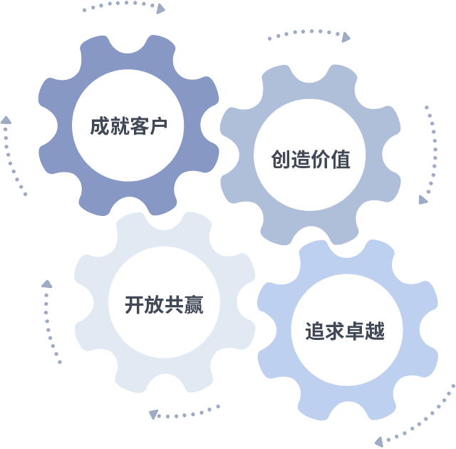 成就客户是一切决策的出发点,,,,创造价值是衡量所有工作的标准,,,,追求卓越是我们做事做人的态度,,,,开放共赢是我们的格局也是最终的结果。。价值观的齿轮环环相扣,,推动着组织里的每个人不断向前。。。